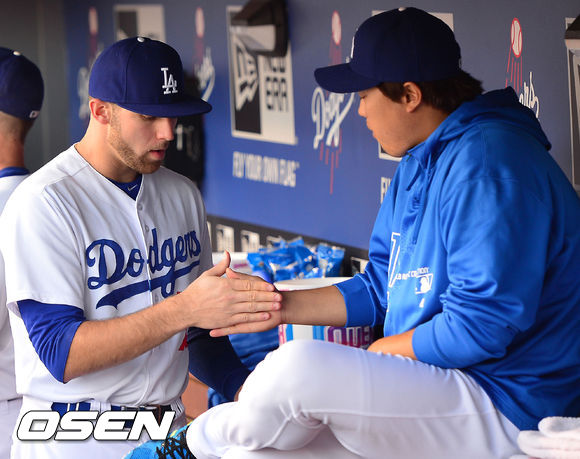 29일 (이하 한국시간) 미국 캘리포니아주 로스앤젤레스 다저스타디움에서 열린 2013 메이저리그 LA 다저스와 콜로라도 로키스의 경기, 다저스 덕아웃에서 로드리게스가 류현진과 손바닥을 펴며 하이파이브를 하고 있다.