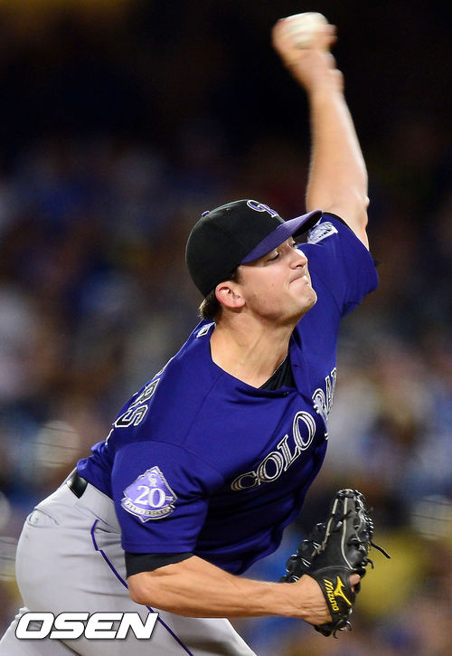 29일 (이하 한국시간) 미국 캘리포니아주 로스앤젤레스 다저스타디움에서 열린 2013 메이저리그 LA 다저스와 콜로라도 로키스의 경기, 8회말 2사 주자 1루 다저스 곤잘레스 타석에 마운드에 오른 콜로라도 렉스 브라더스가 힘차게 공을 뿌리고 있다.