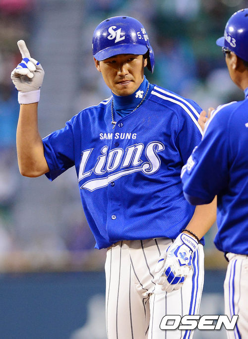 29일 오후 서울 잠실구장에서 열린 '2013 한국야쿠르트 세븐 프로야구' LG 트윈스와 삼성 라이온즈의 경기 2회초 1사 만루 김상수가 1타점 적시타를 치고 기뻐하고 있다.