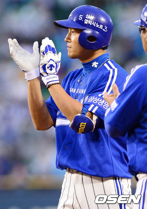 29일 오후 서울 잠실구장에서 열린 '2013 한국야쿠르트 세븐 프로야구' LG 트윈스와 삼성 라이온즈의 경기 2회초 1사 만루 김상수가 1타점 적시타를 치고 기뻐하고 있다.