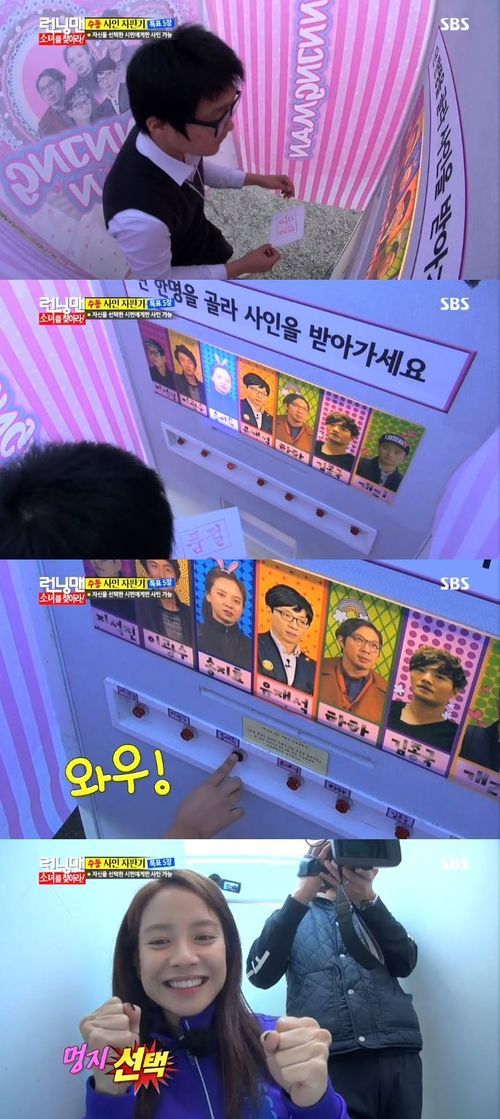 '런닝맨' 멤버들은 29일 오후 방송된 '런닝맨'에서 각각 자판기 속에 들어가 자신의 이름을 눌러준 사람에게만 사인을 해 줄 수 있는 수동 사인 자판기 미션에 도전했다.