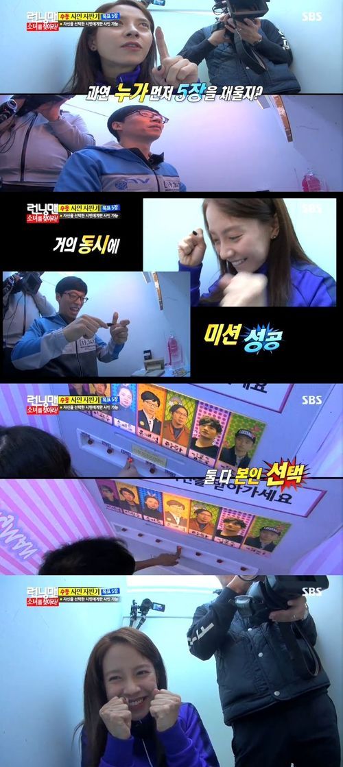 송지효와 유재석은 29일 오후 방송된 SBS '일요일이 좋다-런닝맨'(이하 '런닝맨')에서 다른 멤버들과 함께 각각 남양주시 곳곳에 설치된 사인자판기 부스에서 자신의 이름을 누르는 사람에게만 사인을 해주는 미션에 도전했다. 5장의 사인을 해줄 경우 가장 먼저 다음 미션에 대한 힌트를 얻는 상황.
