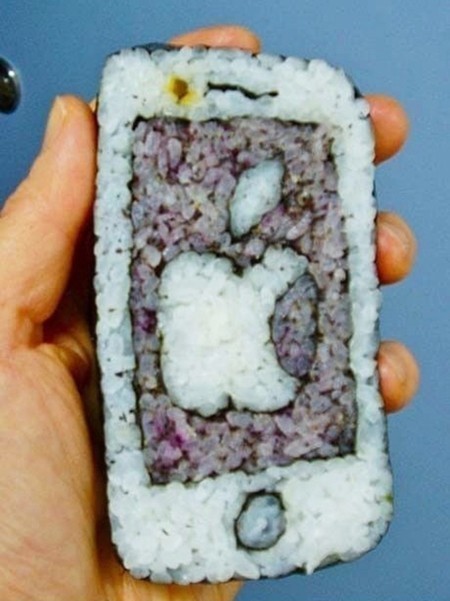 사진 속 김밥 스마트폰은 딱 아이폰 크기다. 직사각형 모양으로 김밥을 만들고 속을 애플 로고마냥 한입 먹은 사과를 새겼다. 재미난 것은 김밥 아랫쪽에 스위치 버튼과 테두리를 흰 밥으로 예쁘게 두른 점에서 단연 센스가 돋보였다는 사실이다.