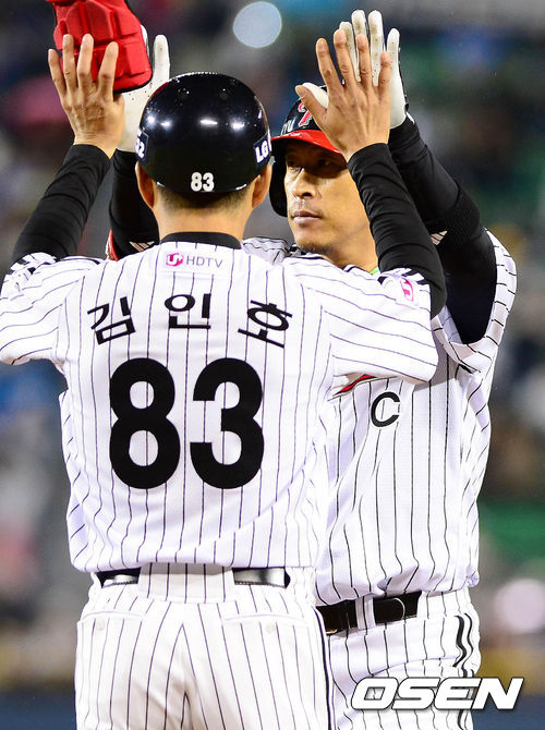 29일 오후 서울 잠실구장에서 열린 '2013 한국야쿠르트 세븐 프로야구' LG 트윈스와 삼성 라이온즈의 경기 4회초 2사 2,3루 이병규가 2타점 적시타를 치고 김인호 코치와 하이파이브를 하고 있다.