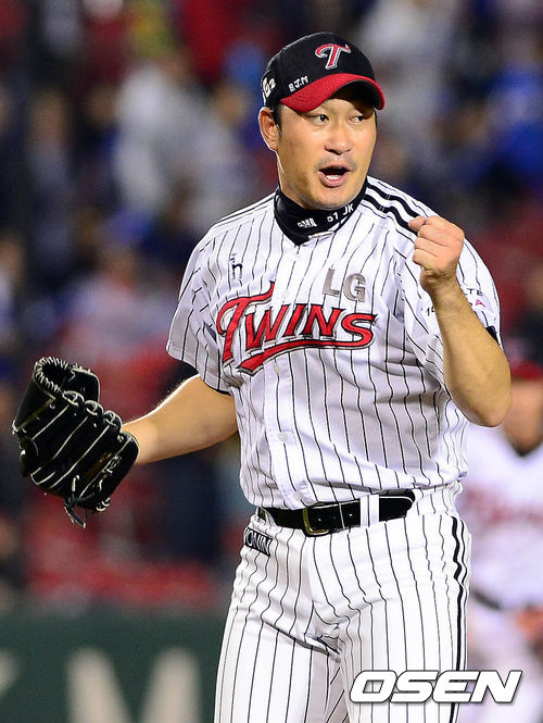 29일 오후 서울 잠실구장에서 열린 '2013 한국야쿠르트 세븐 프로야구' LG 트윈스와 삼성 라이온즈의 경기 종료 후 봉중근이 승리를 기뻐하고 있다.