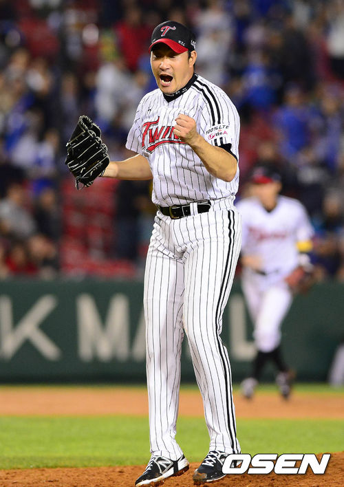 29일 오후 서울 잠실구장에서 열린 '2013 한국야쿠르트 세븐 프로야구' LG 트윈스와 삼성 라이온즈의 경기 종료 후 봉중근이 승리를 기뻐하고 있다.