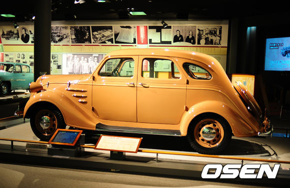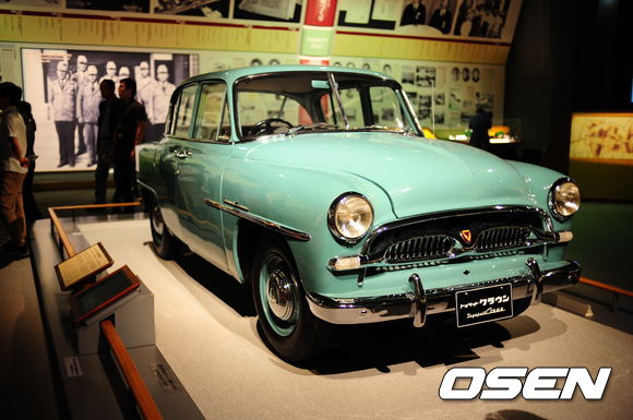 1955년에 생산 된 본격 일본 국산차 ‘토요페트 크라운 RS’. 가운데 사진은 1936년 9월에 발표 된 토요타 최초의 생산형 승용차 ‘AA’. ‘TOYOTA’ 브랜드명이 확립 되기 전이라 휠에 새겨진 ‘TOYODA’가 선명하다.