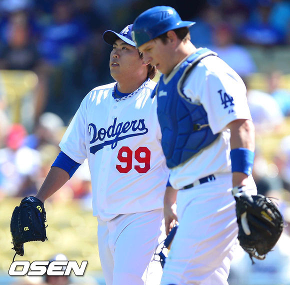 30일 (이하 한국시간) 미국 캘리포니아주 로스앤젤레스 다저스타디움에서 열린 2013 메이저리그 LA 다저스와 콜로라도 로키스의 경기,1회초 무사 만루 콜로라도 툴로비츠키에게 선취점을 허용한 후 아쉬워하고 있다.