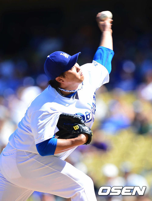 30일 (이하 한국시간) 미국 캘리포니아주 로스앤젤레스 다저스타디움에서 열린 2013 메이저리그 LA 다저스와 콜로라도 로키스의 경기,2회초 다저스 류현진 선발투수가 역투하고 있다.