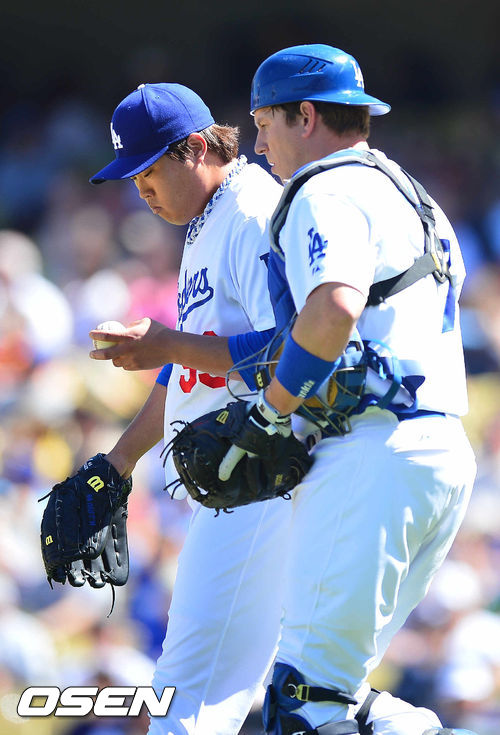 30일 (이하 한국시간) 미국 캘리포니아주 로스앤젤레스 다저스타디움에서 열린 2013 메이저리그 LA 다저스와 콜로라도 로키스의 경기,1회 무사 만루 콜로라도 툴로비츠키에게 선취점을 허용한 다저스 류현진이 A.J 엘리스 포수의 격려를 받고 있다.