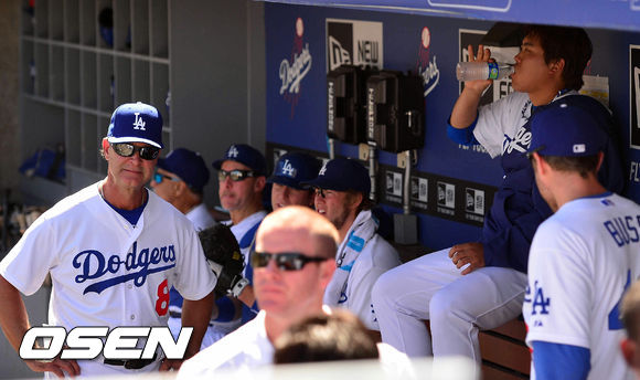30일 (이하 한국시간) 미국 캘리포니아주 로스앤젤레스 다저스타디움에서 열린 2013 메이저리그 LA 다저스와 콜로라도 로키스의 경기, 1회 이닝종료 후 다저스 류현진이 물을 마시고 있다.