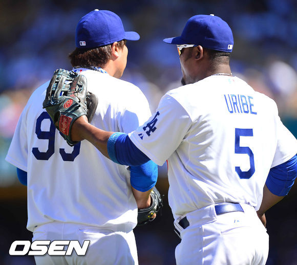 4회초 1사 1,3루 콜로라도 러틀리지의 투수 앞 땅볼때 다저스 류현진이 3루 주자 파체코를 협살로 아웃시킨후 유리베의 격려를 받고 있다. / rumi@osen.co.kr