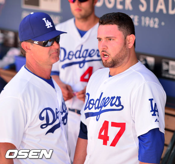 5회 다저스 선발 류현진 대신 마운드에 오른 놀라스코가 5회를 마치고 덕아웃에서 매팅리 감독과 얘기를 나누고 있다. / rumi@osen.co.kr