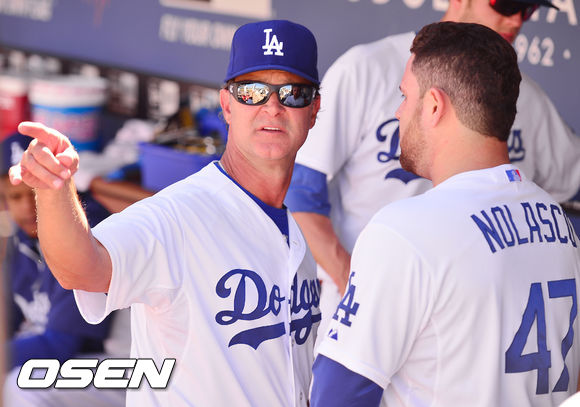 5회 다저스 선발 류현진 대신 마운드에 오른 놀라스코가 5회를 마치고 덕아웃에서 매팅리 감독과 얘기를 나누고 있다. / rumi@osen.co.kr