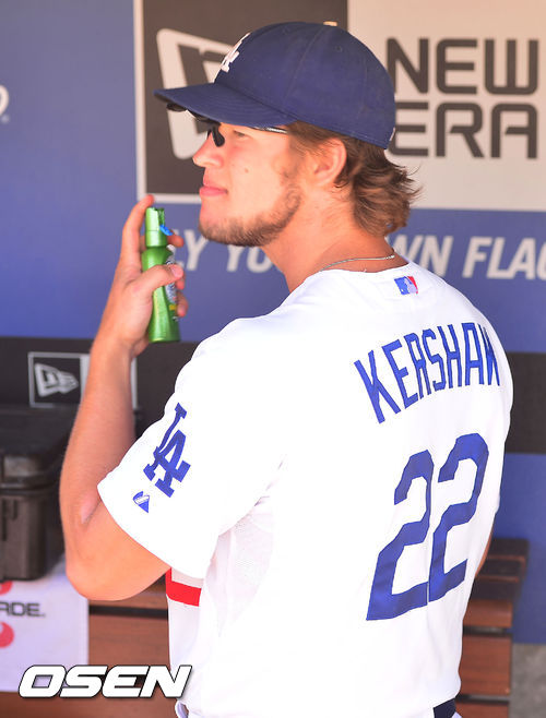 커쇼가 덕아웃에서 스프레이형 UV로션을 뿌리고 있다. / rumi@osen.co.kr