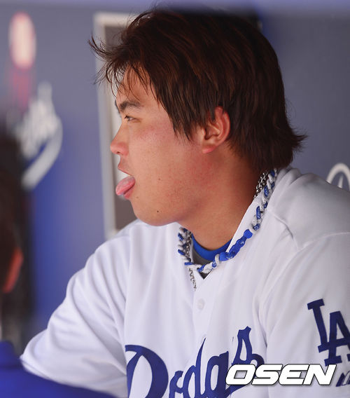 4회 이닝종료후 교체된 다저스 류현진이 덕아웃에서 혀를 내밀고 있다./ rumi@osen.co.kr