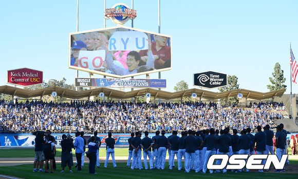 경기를 마치고 지구우승 기념 행사에서 전광판에 류현진의 응원 모습이 나오는 모습을 선수들과 팬들이 지켜보고 있다./ rumi@osen.co.kr