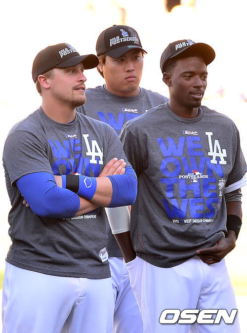경기를 마치고 지구우승 기념 행사에서 류현진이 어리둥절한 표정을 짓고 있다./ rumi@osen.co.kr