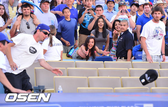 경기를 마치고 지구우승 기념 행사에서 선수들이 모자를 던져주자 팬들이 잡으려 하고 있다./ rumi@osen.co.kr
