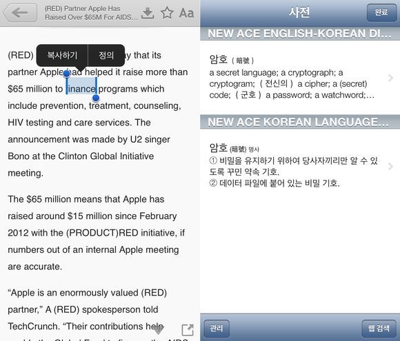 또 한국어 사전과 영한사전, 한영사전이 새롭게 추가됐다. 웹사이트나 문서, 메모 등 에서 색하고자 하는 단어를 택한 뒤, 활성화되는 메뉴 중 '정의'를 선택하면 바로 뜻을 알 수 있다. iOS7은 사전을 적용해 동의어와 예문 등 다양한 정보를 볼 수 있을 뿐 아니라, 사용자가 선택한 사전 종류에 따라 한 단어에 대한 여러 언어 결과도 한 화면에 볼 수 있다.