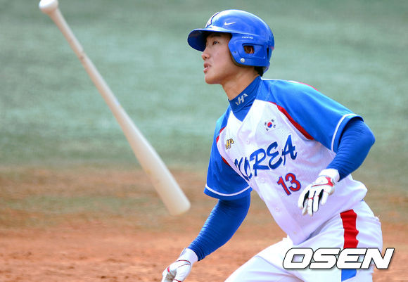 6회말 2사 만루 대표팀 이성규가 3타점 2루타를 때리고 있다.