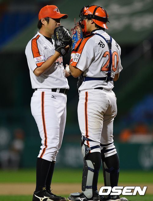 2회초 삼성 공격, 무사 1루 상황 한화 포수 정범모와 투수 윤근영이 마운드에서 대화를 나누고 있다.