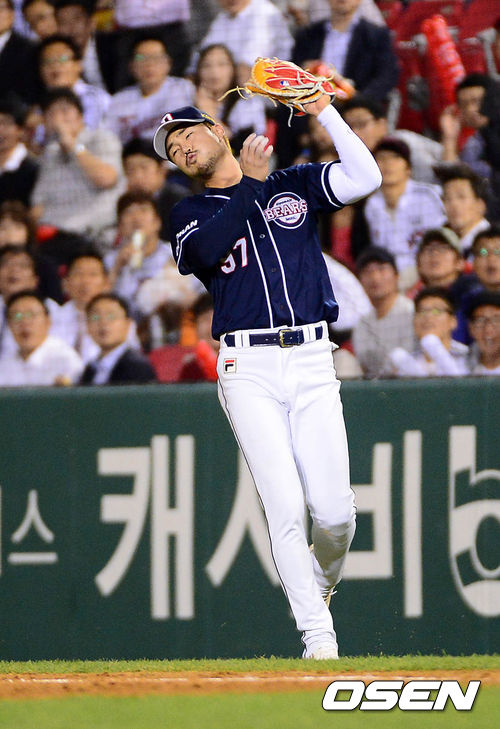 30일 오후 서울 잠실야구장에서 열린 2013 한국야쿠르트 세븐프로야구 LG 트윈스와 두산 베어스의 경기, 2회말 2사 3루에서 두산 오재원이 LG 현재윤을 파울플라이로 처리하고 있다.