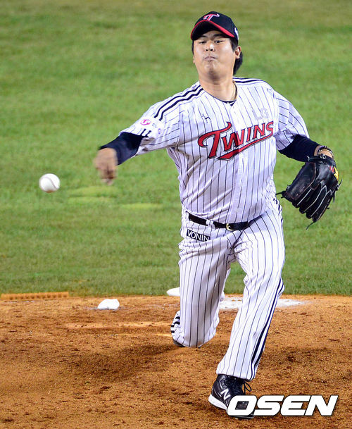 30일 오후 서울 잠실야구장에서 열린 2013 한국야쿠르트 세븐프로야구 LG 트윈스와 두산 베어스의 경기, 3회초 무사에서 LG 김선규가 힘차게 공을 던지고 있다.