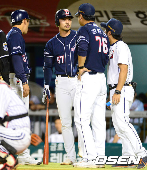 30일 오후 서울 잠실야구장에서 열린 2013 한국야쿠르트 세븐프로야구 LG 트윈스와 두산 베어스의 경기, 4회초 두산 오재원이 스윙 중 무릎 통증을 호소하고 있다.