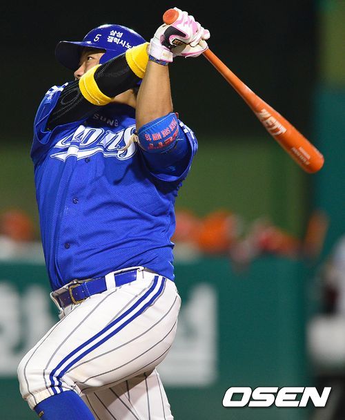 5회초 삼성 공격 2사 주자 없는 상황 3번 박석민이 우중간 솔로포를 날리고 타구를 바라보고 있다.