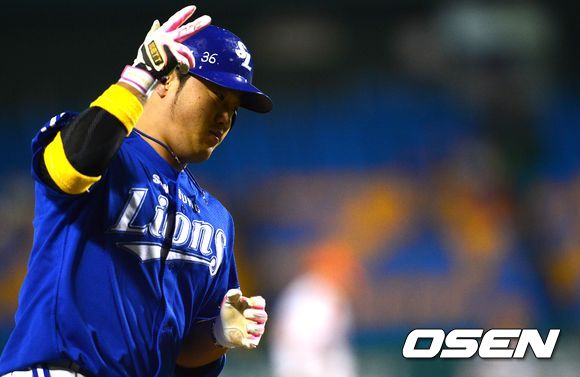 5회초 삼성 공격 2사 주자 없는 상황 3번 박석민이 우중간 솔로포를 날리고 환호하며 그라운드를 돌고 있다.