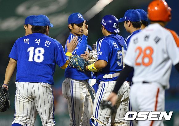 삼성 선수들이 마운드에서 하이파이브를 나누고 있다./dreamer@osen.co.kr