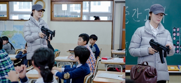 1일 제작진이 공개한 사진에는 모자를 깊숙이 눌러 쓴 최지우가 가방에서 기관단총을 꺼내 들고 있는 모습이 담겨 있다. 그런데 사진의 배경이 되는 장소는 은행이 아니라 뜻밖에도 초등학교 교실. 최지우는 총을 들고 감정 없는 인간로봇처럼 무표정한 모습이다. 수업시간에 교실로 쳐들어간 최지우가 학생들을 향해 총구를 겨누고 있어 눈길을 끈다.