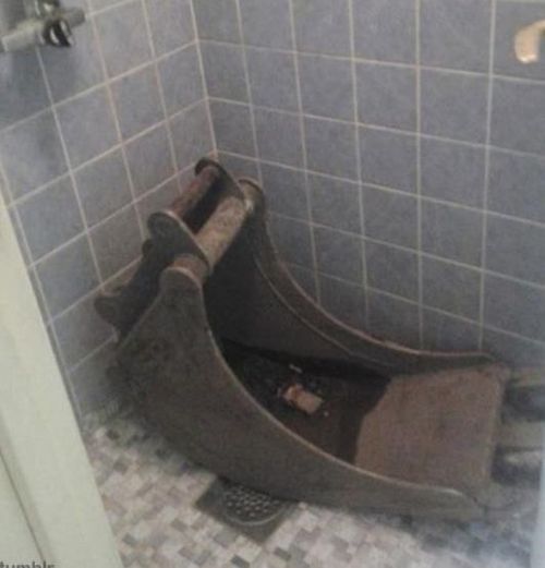 최근 온라인 커뮤니티에 ‘샤워실의 중장비 미스터리’란 제목의 사진이 올라왔다. 샤워실에 포크레인의 거대한 삽이 그대로 들어와 있는 것. 무게가 족히 수 백 kg은 돼 보인다. 황당한 사건에 놀란 주인공은 사진을 찍어 인터넷에 올렸다.