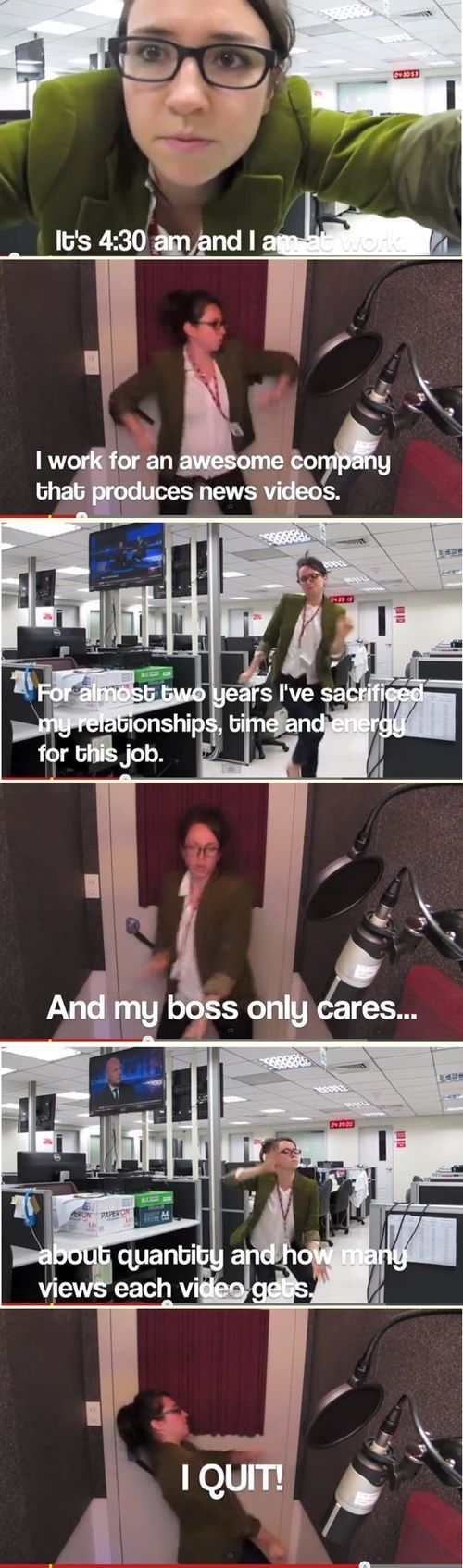 동영상의 주인공은 미국의 한 20대 여성. 그녀는 한 뉴스 영상 제작사에서 2년 동안 사생활을 희생해 가며 열심히 일했으나 상사는 성과에만 관심이 있다는 내용을 춤과 자막으로 표현했다.
