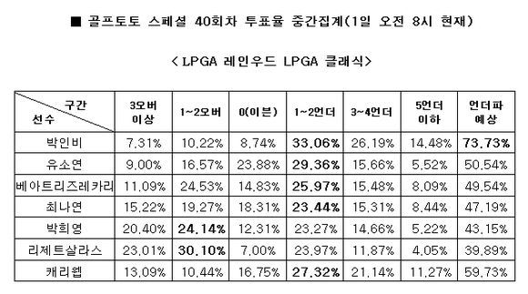 3번 선수로 지정된 베아트리즈 레카리(49.54%)를 비롯해, 4번 최나연(47.19%), 5번 박희영(43.15%)은 모두 언더파 확률이 절반을 넘지 못했고, 6번 선수로 선정된 리제트 살라스는 39.89%로 7명의 선수 중에 가장 저조한 성적을 기록할 것으로 내다봤다.
