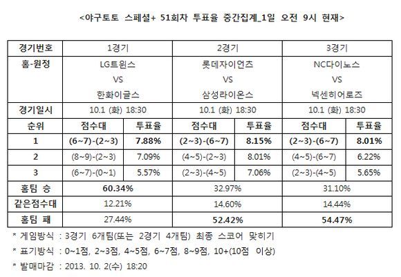 KBO 3경기 대상 야구토토 스페셜+ 51회차 투표율 중간집계