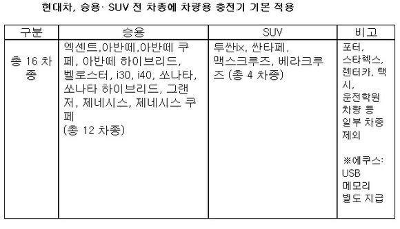 현대자동차는 세계 최초로 1일부터 소비자에게 인도되는 승용·SUV 전 차종에 시가라이터 대신 충전용 USB를 기본 적용한다.