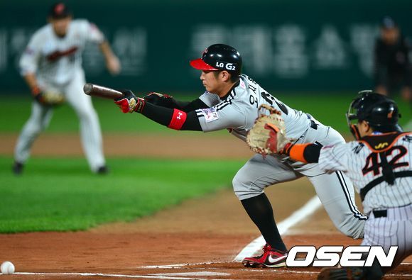 1회초 LG 공격 무사 2루 상황, 2번 오지환이 희생번트를 시도하고 있다. 번트 타구를 잡은 롯데 선발 김사율의 3루 송구로 인해 2루 주자 박용택은 아웃.