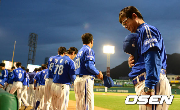 1일 오후 대전구장에서 열린 '2013 한국야쿠르트 세븐 프로야구' 한화 이글스와 삼성 라이온즈의 경기, 경기에 앞서 삼성 류중일 감독이 국민의례를 마치고 더그아웃으로 향하고 있다.