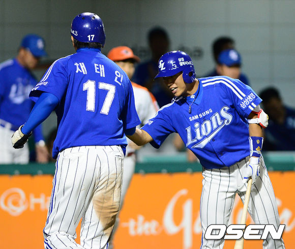 1일 오후 대전구장에서 열린 '2013 한국야쿠르트 세븐 프로야구' 한화 이글스와 삼성 라이온즈의 경기, 2회초 1사 2,3루에서 삼성 채태인이 이정식의 유격수 땅볼에 홈을 밟고 정병곤과 하이파이브를 하고 있다.