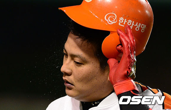 1일 오후 대전구장에서 열린 '2013 한국야쿠르트 세븐 프로야구' 한화 이글스와 삼성 라이온즈의 경기, 1회말 2사에서 한화 김태균이 삼진을 당하고 아쉬워하고 있다.