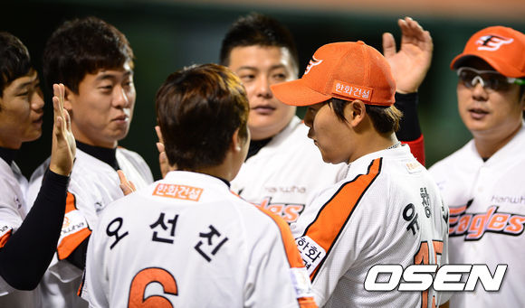 1일 오후 대전구장에서 열린 '2013 한국야쿠르트 세븐 프로야구' 한화 이글스와 삼성 라이온즈의 경기, 3회초 무사 1,2루의 위기를 한화 유창식이 무실점으로 막으며 더그아웃에서 동료선수들과 하이파이브를 하고 있다.