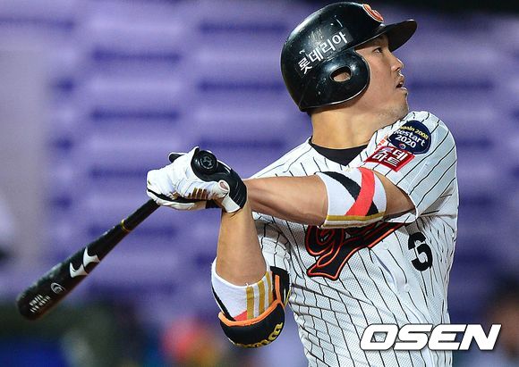 4회말 롯데 공격 1사 2루 상황 5번 박종윤이 유격수와 중견수 사이에 떨어지는 동점 1타점 적시타를 날리고 있다.