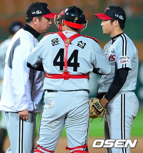 4회말 롯데 공격 1사 1, 2루 상황 마운드에 오른 차명석 코치가 LG 선발 신정락과 대화를 나누고 있다.