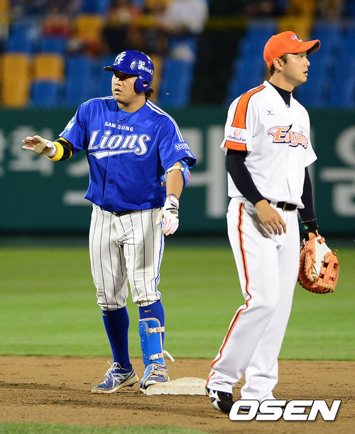 1일 오후 대전구장에서 열린 '2013 한국야쿠르트 세븐 프로야구' 한화 이글스와 삼성 라이온즈의 경기, 5회초 1사 2,3루에서 삼성 박석민이 역전 2타점 적시 2루타를 날리고 타임을 외치고 있다.