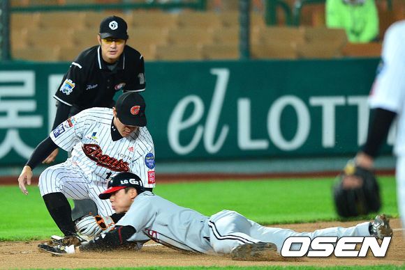 6회초 LG 공격 1사 2루 상황 8번 윤요섭의 내야 땅볼 때 2루 주자 김용의가 3루까지 내달렸지만 롯데 3루수 황재균의 태그에 걸려 아웃되고 있다.