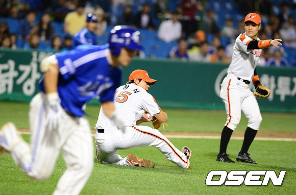 1일 오후 대전구장에서 열린 '2013 한국야쿠르트 세븐 프로야구' 한화 이글스와 삼성 라이온즈의 경기, 5회초 무사 1,2루에서 한화 유창식이 삼성 박한이의 번트 타구를 잡으며 넘어지고 있다.