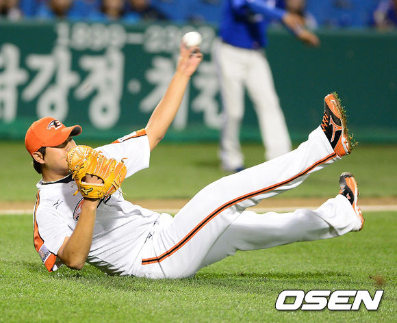 1일 오후 대전구장에서 열린 '2013 한국야쿠르트 세븐 프로야구' 한화 이글스와 삼성 라이온즈의 경기, 5회초 무사 1,2루에서 한화 유창식이 삼성 박한이의 번트 타구를 잡다 넘어지며 1루로 송구하고 있다.