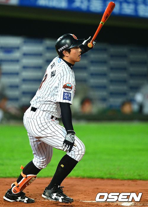 6회말 롯데 공격 2사 1, 2루 상황 7번 황재균이 역전 1타점 우중간 안타를 날리고 있다.